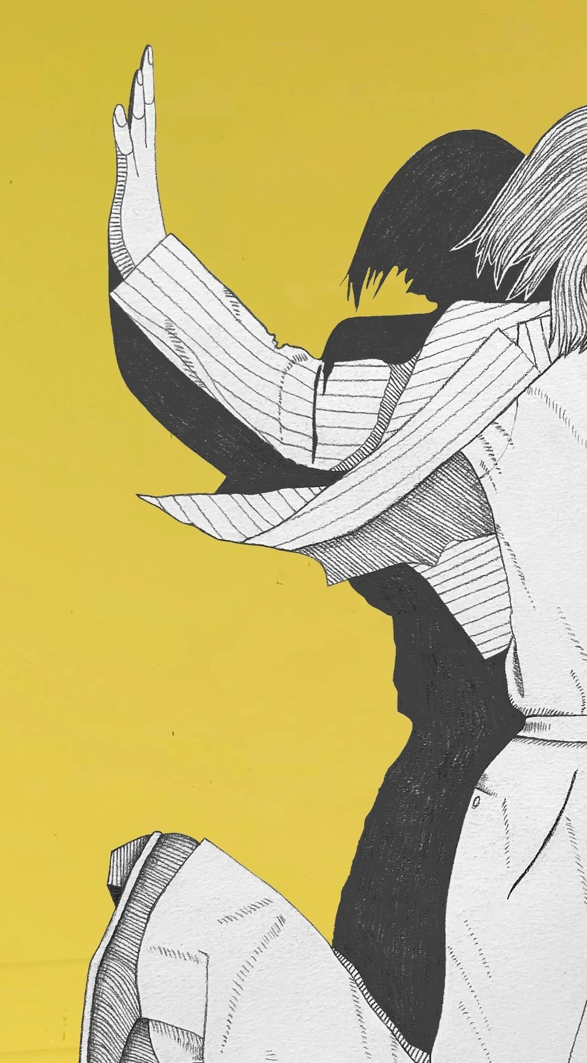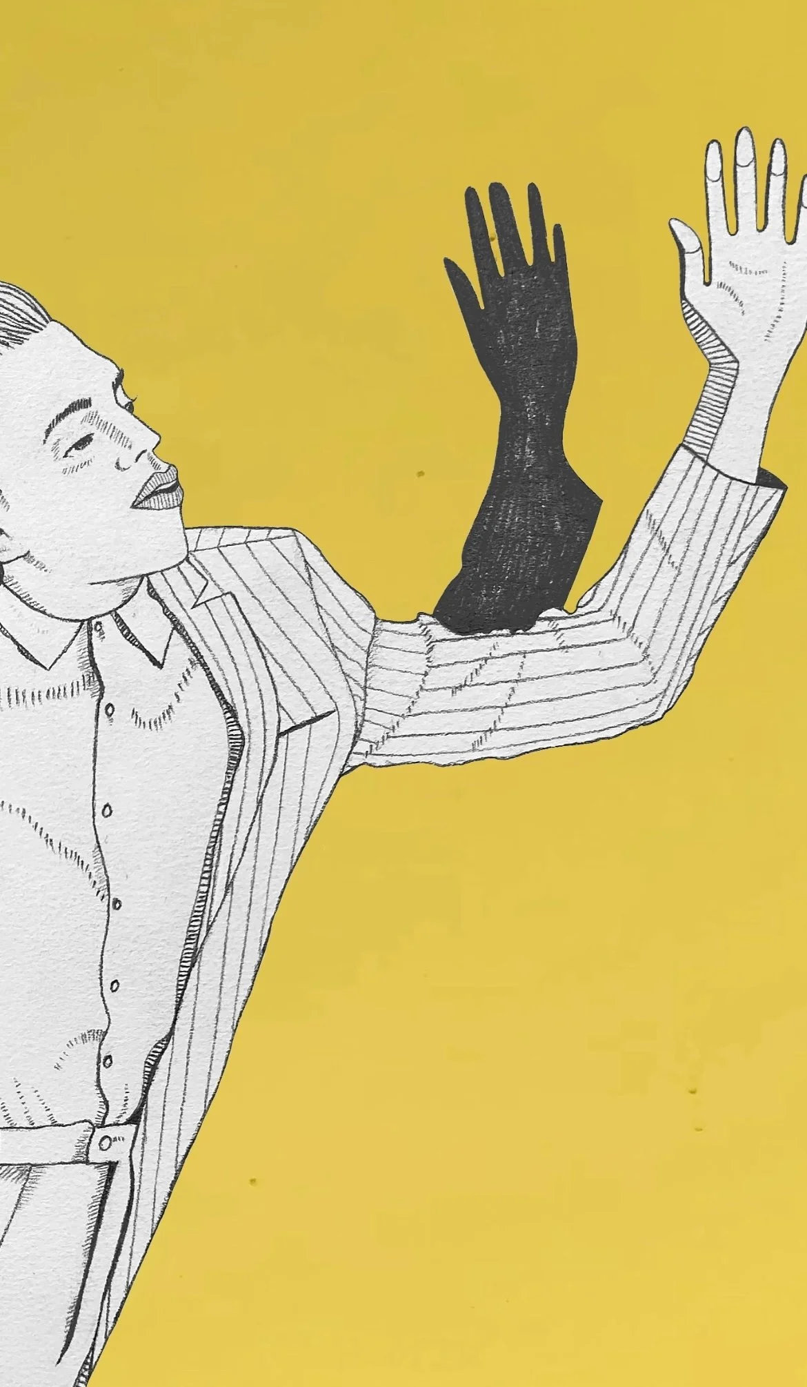 This print was made from an original pencil sketch of a man in a pinstripe suit leaping in the air. The image behind was taken out a window on a smoggy evening in Seattle.
